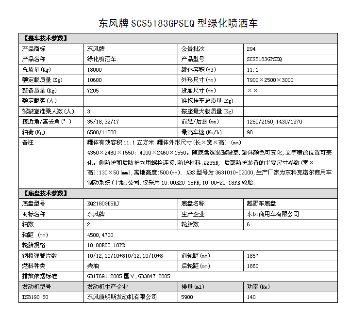 潤(rùn)知星牌SCS5183GPSEQ四驅(qū)越野消防灑水車(chē),東風(fēng)越野四驅(qū)森林消防供水車(chē)采用東風(fēng)D913新款駕駛室(可選裝老款153駕駛室),4*4驅(qū)動(dòng),ISB190 50國(guó)五發(fā)動(dòng)機(jī),4500mm/4700mm軸距,東風(fēng)六檔變速箱,10.00R20鋼絲胎,東風(fēng)商用車(chē)前后橋,罐體采用優(yōu)質(zhì)碳鋼QB235板材,罐體容積11.1立方,前沖后灑,側(cè)噴,后置工作平臺(tái)帶消防水炮,可選裝消防炮,消防泵等專用消防設(shè)備。主要用途:中國(guó)森林林業(yè)部門(mén)的森林消防滅火供水及利用車(chē)載消防泵消防炮進(jìn)行遠(yuǎn)程消滅森林火災(zāi)。