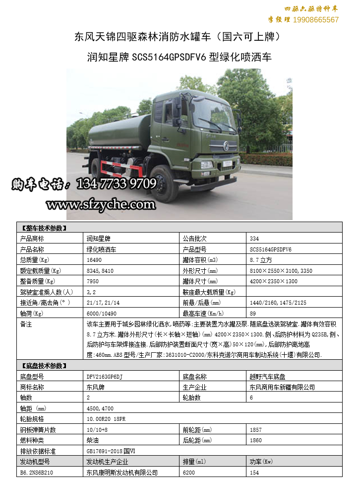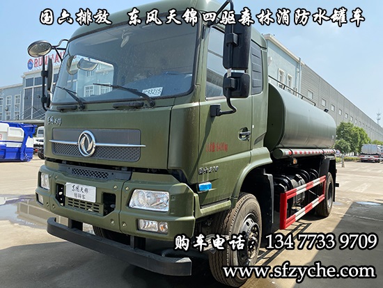 東風(fēng)天錦四驅(qū)森林消防灑水車(chē)_國(guó)六排放潤(rùn)知星牌SCS5164GPSDFV6型四驅(qū)越野綠化噴灑車(chē)采用DFV2163GP6DJ型國(guó)六排放東風(fēng)天錦四驅(qū)越野底盤(pán),東風(fēng)天錦D530一排半駕駛室,4×4驅(qū)動(dòng),康明斯B6.2NS6B210國(guó)六發(fā)動(dòng)機(jī)210馬力,最大扭矩850N.m/1100-1700rpm,排量6.2L、韶齒手動(dòng)六檔變速箱,東風(fēng)德納車(chē)橋,前驅(qū)動(dòng)橋4.5噸,后橋10噸,10.00R20輪胎,軸距4500mm/4700mm,電動(dòng)玻璃,方向助力,斷氣剎,ABS,大燈自動(dòng)調(diào)節(jié),自動(dòng)調(diào)整臂,選裝原廠空調(diào)。罐體采用優(yōu)質(zhì)碳鋼Q235板材,板材厚度4mm,罐體容積8.7立方,安裝夾心取力器,后置泵箱,消防栓接口左右各一個(gè),消防炮采用PS30-50D消防水炮,流量40L/S/1.0MPa 水射程:≥50m,消防泵采用常壓消防泵型號(hào):CB10/40車(chē)用消防泵,流量:40L/s,壓力:1.0MPa,駕駛室頂部安裝長(zhǎng)條警燈帶喊話(huà)器,兩側(cè)噴涂白色森林消防字樣。