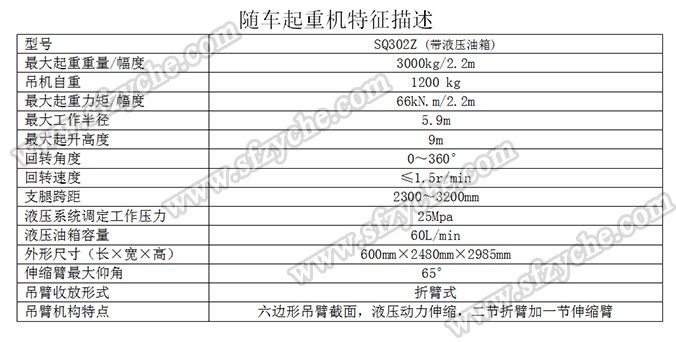 凈功率206kw; 起重機型號為:SQ302Z(帶液壓油箱),起重機質量為:1200kg,最大額定超升載荷為:3000kg. 側防護金屬材料Q235斷面槽形,螺栓連接,斷面高度40mm,離地高度450mm; 后防護金屬材料Q235斷面槽形,螺栓連接,斷面高度135mm,離地高度500mm; 安裝具有衛(wèi)星定位功能行駛記錄儀,東風越野隨車吊:www.clxia888.com 吊機詳細參數(shù):
