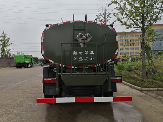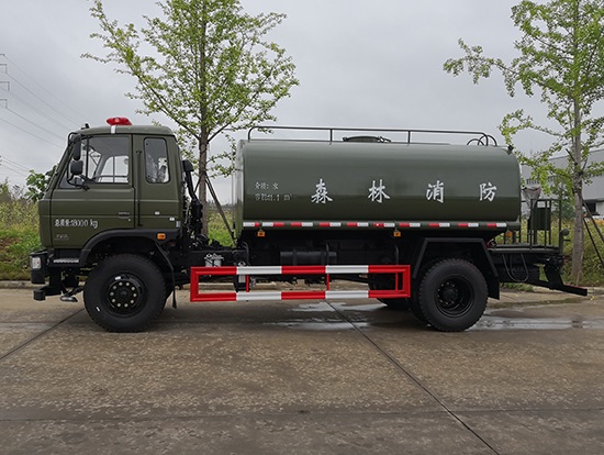 采用東風(fēng)EQ2180GD5DJ型越野汽車(chē)底盤(pán),東風(fēng)一排半寬體駕駛室,4×4驅(qū)動(dòng),康明斯ISB190 50國(guó)五發(fā)動(dòng)機(jī),六檔變速箱,東風(fēng)商用車(chē)橋,前驅(qū)動(dòng)橋3.8噸,后橋10噸,10.00R20輪胎,軸距4500mm,電動(dòng)玻璃,方向助力,斷氣剎,ABS。罐體采用優(yōu)質(zhì)碳鋼QB235板材,板材厚度4mm,罐體容積11.1立方,變速箱安裝取力器,大功率水泵可泵進(jìn)泵出,后置工作平臺(tái)帶水炮射程25米,消防栓接口左右各一個(gè),選裝駕駛室頂部安裝長(zhǎng)條警燈帶喊話器,全車(chē)顏色軍綠,兩側(cè)噴涂白色森林消防字樣。
