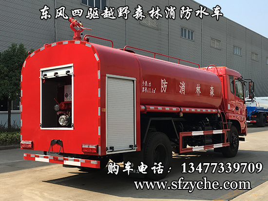 東風(fēng)新款四驅(qū)越野森林消防灑水車_東風(fēng)11.1噸四驅(qū)消防水車_國五四驅(qū)越野森林滅火水車_東風(fēng)4×4越野SCS5183GPSEQ型四驅(qū)綠化噴灑車簡介:采用東風(fēng)EQ2180GD5DJ型越野汽車底盤,東風(fēng)D913新款駕駛室,4×4驅(qū)動,康明斯ISB190 50國五發(fā)動機(jī),六檔變速箱,東風(fēng)商用車橋,前驅(qū)動橋3.8噸,后橋10噸,10.00R20輪胎,軸距4500mm,電動玻璃,方向助力,斷氣剎,ABS。罐體采用優(yōu)質(zhì)碳鋼Q235板材,板材厚度4mm,罐體容積11.1立方,安裝夾心取力器,后置泵箱,消防栓接口左右各一個,消防炮采用PS30-50D消防水炮,流量40L/S/1.0MPa 水射程:≥50m,消防泵采用常壓消防泵型號:CB10/40車用消防泵,流量:40L/s,壓力:1.0MPa,帶前沖,駕駛室頂部安裝長條警燈帶喊話器,全車顏色橘紅,兩側(cè)噴涂白色森林消防字樣。