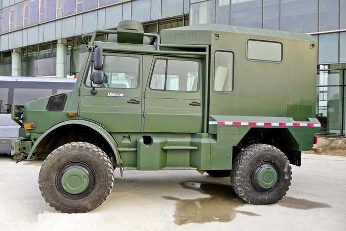 底盤介紹:烏尼莫克U5000擁有兩種軸距分別為3250mm和3850mm,6m的車身長度配合將近2.5m的寬度讓車內(nèi)的空間利用率發(fā)揮到了極致。車頭部分的高度已經(jīng)將近3m,如果加上后加裝的車廂,各位可以想象遇到較低的限高時(shí)是多么尷尬。門式車橋在此無需多言,接近500mm的離地間隙,再加上1.2m的涉水深度足以面對所有極限路況,此外選裝軍版套件的涉水深度可以達(dá)到1.5m。其零部件及電氣元件有防水保護(hù)、再配合防水式前大燈,輪轂、制動器密封等讓這輛猛獸無所不能。除了基本的車身防護(hù)裝備,“鵝頸式”縱梁的布置,使梯形車架與兩個(gè)相對的縱梁構(gòu)成一個(gè)U字型,并焊接在管狀縱梁上,可允許橫縱梁產(chǎn)生較大的扭轉(zhuǎn)度,通過橫向推桿與螺旋彈簧間的聯(lián)動,能實(shí)現(xiàn)高達(dá)30度的車橋?qū)桥で6c(diǎn)式懸掛也是烏尼莫克實(shí)現(xiàn)極端越野的關(guān)鍵之一,當(dāng)車輛需要對角行駛以越過高差超過0.5米的障礙物時(shí),三點(diǎn)式懸掛可以保證車輛形成大角度移動和扭轉(zhuǎn)。相對于粗狂的外形,烏尼莫克式的內(nèi)飾也顯得相當(dāng)質(zhì)樸,在提倡減少控制面板按鈕的時(shí)代,U5000也有著自己的詮釋,那就是將所有舒適裝備盡可能的簡單化,最大化的給輔助駕控的功能按鈕預(yù)留空間。UG 100-8型變速器具備8前進(jìn)擋、6倒擋帶手自一體功能,其前進(jìn)擋速比為9.57-0.73,倒擋速比為14.56-1.12。兩級常開閥發(fā)動機(jī)制動在這種允許載重超過12500kg的龐然大物上相當(dāng)實(shí)用。看到這樣的空調(diào)面板,你是否會感覺自己回到了90年代,具備三把鎖的U5000,再配合4.8L直列四缸渦輪增壓中冷直噴柴油發(fā)動機(jī)所迸發(fā)出的160kW/2200rpm功率、810Nm/1600rpm扭矩的強(qiáng)大動力數(shù)據(jù),足以保證其優(yōu)異的越野性能,當(dāng)然你還可以再選裝中央輪胎自動充放氣系統(tǒng)。