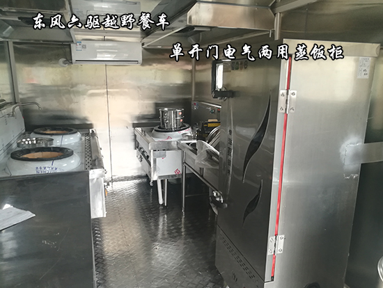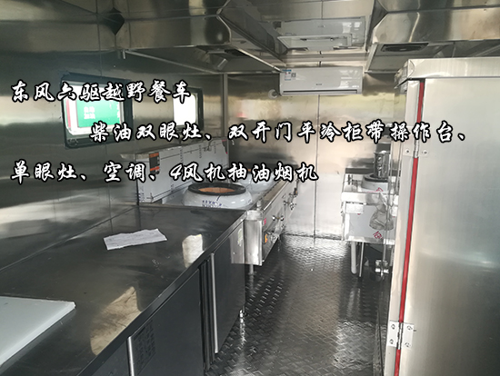東風(fēng)六驅(qū)越野餐車車輛概述:采用東風(fēng)國五越野底盤改裝, 車廂材質(zhì)采用外冷軋鋼板,內(nèi)飾不銹鋼,中間保溫層,隱藏式上車踏步,頂部安全窗,兩個副食灶,一個蒸飯車,抽油煙機,平冷柜,水路,電路,油路等。