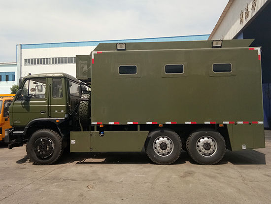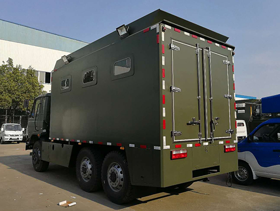 車輛概述:六驅自行炊事車功能簡介:該裝備主要編配于部隊,為部隊官兵野外作業(yè)時提供良好的飲食保障:具有制作食品、保溫食品和儲存食品的空間與功能、并具有提供開水和餐具消毒的功能。采用東風國五越野底盤改裝, 車廂材質采用外冷軋鋼板,內飾不銹鋼,中間保溫層,隱藏式上車踏步,頂部安全窗,兩個副食灶,一個蒸飯車,抽油煙機,平冷柜,水路,電路,油路等。