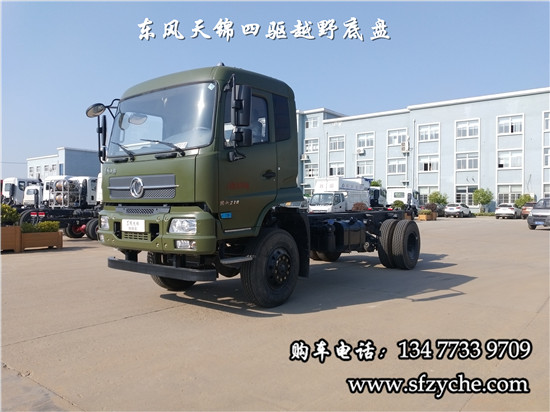 相關(guān)車型國六排放天錦(4×4)越野底盤,采用DFV2163GP6DJ型國六排放東風(fēng)天錦四驅(qū)越野底盤,東風(fēng)天錦D530一排半駕駛室,4×4驅(qū)動,康明斯B6.2NS6B210國六發(fā)動機(jī)210馬力,最大扭矩:850N.m/1100-1700rpm,排量6.2L、韶齒手動六檔變速箱,東風(fēng)德納車橋,前驅(qū)動橋4.5噸,后橋10噸,10.00R20輪胎,軸距4500mm/4700mm,大梁280mm,電動玻璃,方向助力,斷氣剎,ABS,大燈自動調(diào)節(jié),自動調(diào)整臂,選裝原廠空調(diào)。