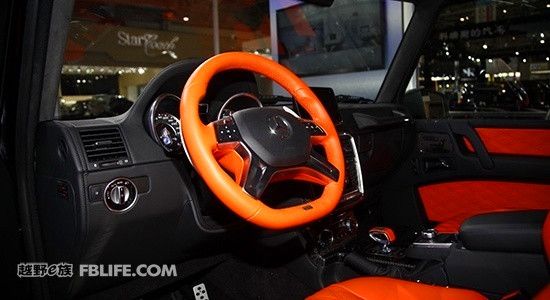 北京車展上的基于G63 AMG 6×6改裝而來(lái)的BRABUS 版700G 6 X 6 內(nèi)飾方面,該車采用了黑色和橘黃色的顏色搭配,強(qiáng)烈的顏色反差構(gòu)造出不錯(cuò)的視覺(jué)效果。四幅式真皮方向盤外圈也采用橘黃色真皮包裹,搭配顏色裝飾條,視覺(jué)效果極佳。擋把的設(shè)計(jì)類似于飛機(jī)操作感,上面印有巴博斯的標(biāo)志,非常具有設(shè)計(jì)感。